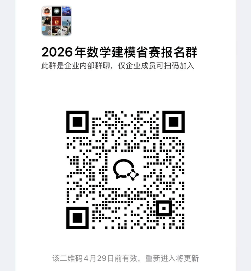6.竞赛报名:请参赛同学自行组队(每队3人,可以不同专业、不同年级同学组队),所有报名同学均需通过企业微信扫码加入企业微信群(2026年数学建模省赛报名群),进群后填写报名表,每个参赛队由其中1名参赛同学填写报名即可。