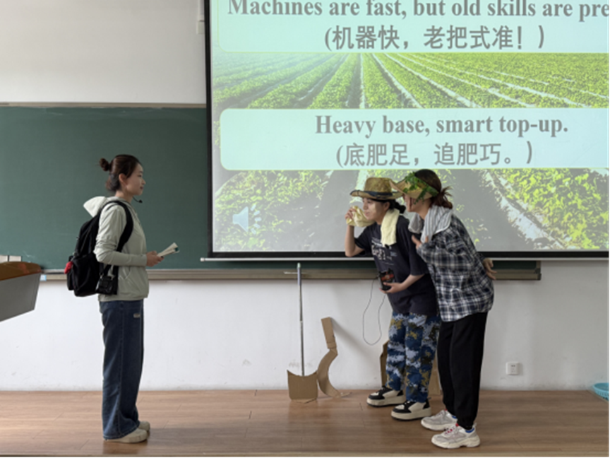 接下来是“英语话农耕”情景剧表演环节。同学们积极参与,认真准备,共有6个小组进行了展示。同学们化身“古代农夫”“现代新农人”等,围绕“农耕古今谈”“节气与农事”等主题展开创意表演。有的小组重现了古人“晨兴理荒秽,带月荷锄归”的辛勤劳作场景;有的则以现代视角,展现智慧农业与传统农耕的碰撞;还有小组结合农历二十四节气,用英语讲述古人顺应天时、春耕秋收的智慧。同学们流利的英语表达、生动的肢体语言和默契的团队配合,以及精心制作的农耕道具等,赢得现场阵阵掌声,将活动氛围推向高潮。